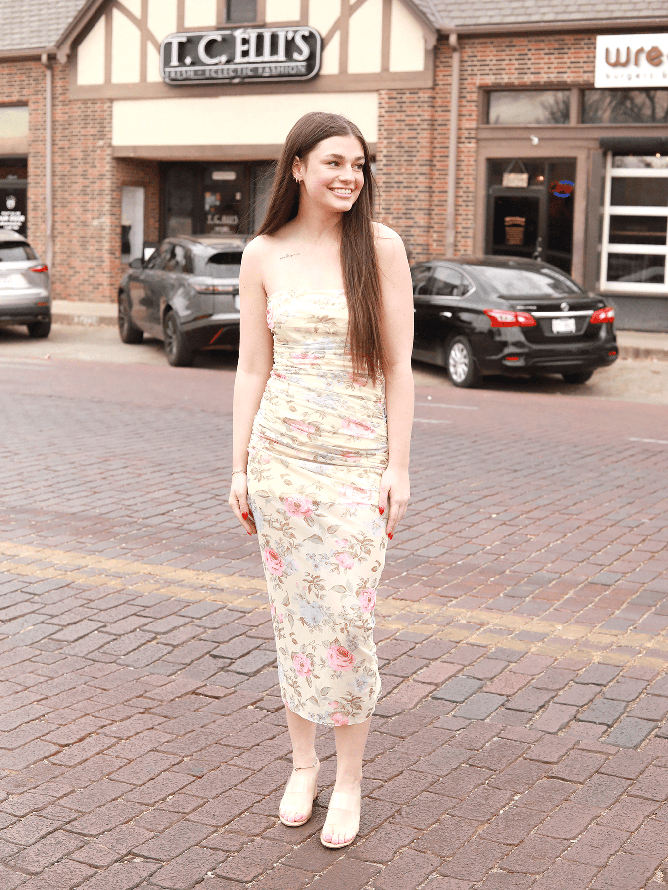 Float through your day with effortless charm in the Paloma Breeze Dress. Featuring delicate floral prints on lightweight mesh fabric, this midi dress combines romantic femininity with modern style. The shirred detailing adds a flattering fit while keeping the silhouette soft and flowy.