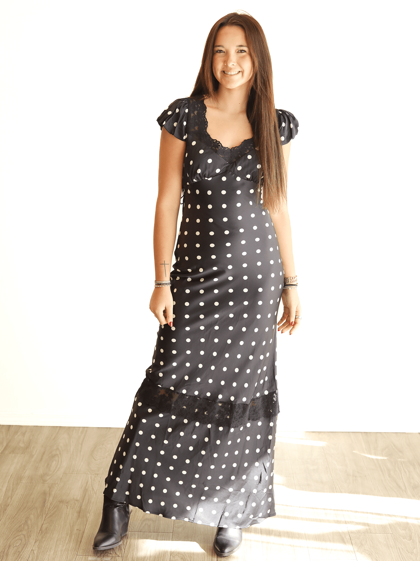 Make a graceful statement with the So Be It Dress, a stunning polka dot satin maxi dress designed for effortless elegance. Crafted from smooth, lustrous satin, this dress drapes beautifully, creating a flattering and flowy silhouette. The classic polka dot pattern adds a timeless charm, making it perfect for both day events and evening occasions.