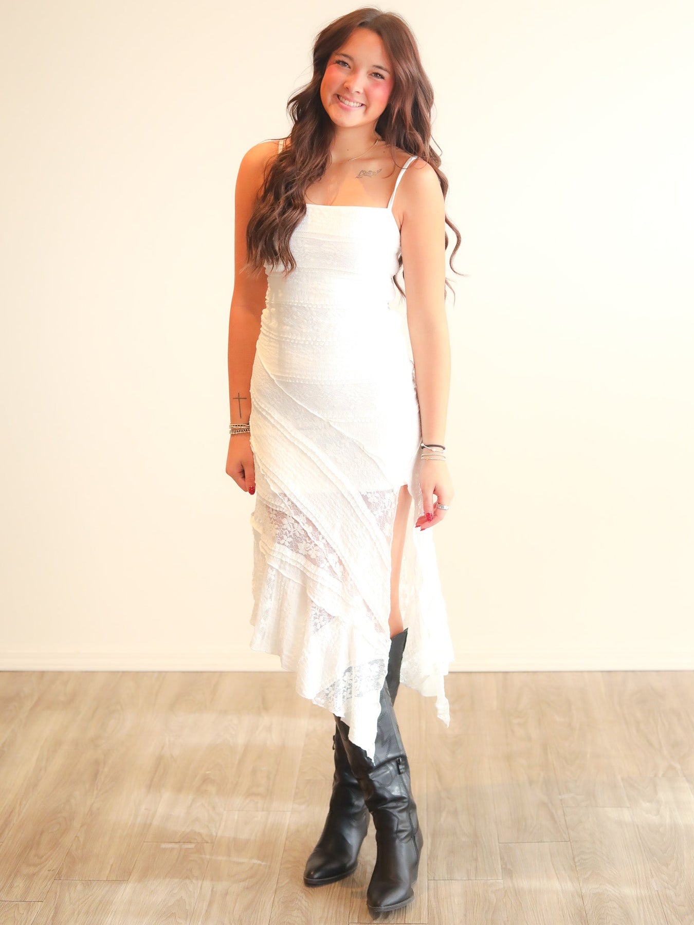 Dainty Floral Lace Midi Dress Square Neckline with Adjustable Spaghetti Straps Soft Floral Lace Fabric with Stretch Lining Asymmetrical Hemline with Flowy Silhouette High Thigh Slit Detail for a Flirty Touch Delicate Sheer Lace Panels Throughout Double-Lined for Comfortable Coverage Romantic Feminine Fit with Western-Inspired Charm Perfect for Summer, Fall, Festival, or Boho Western Looks