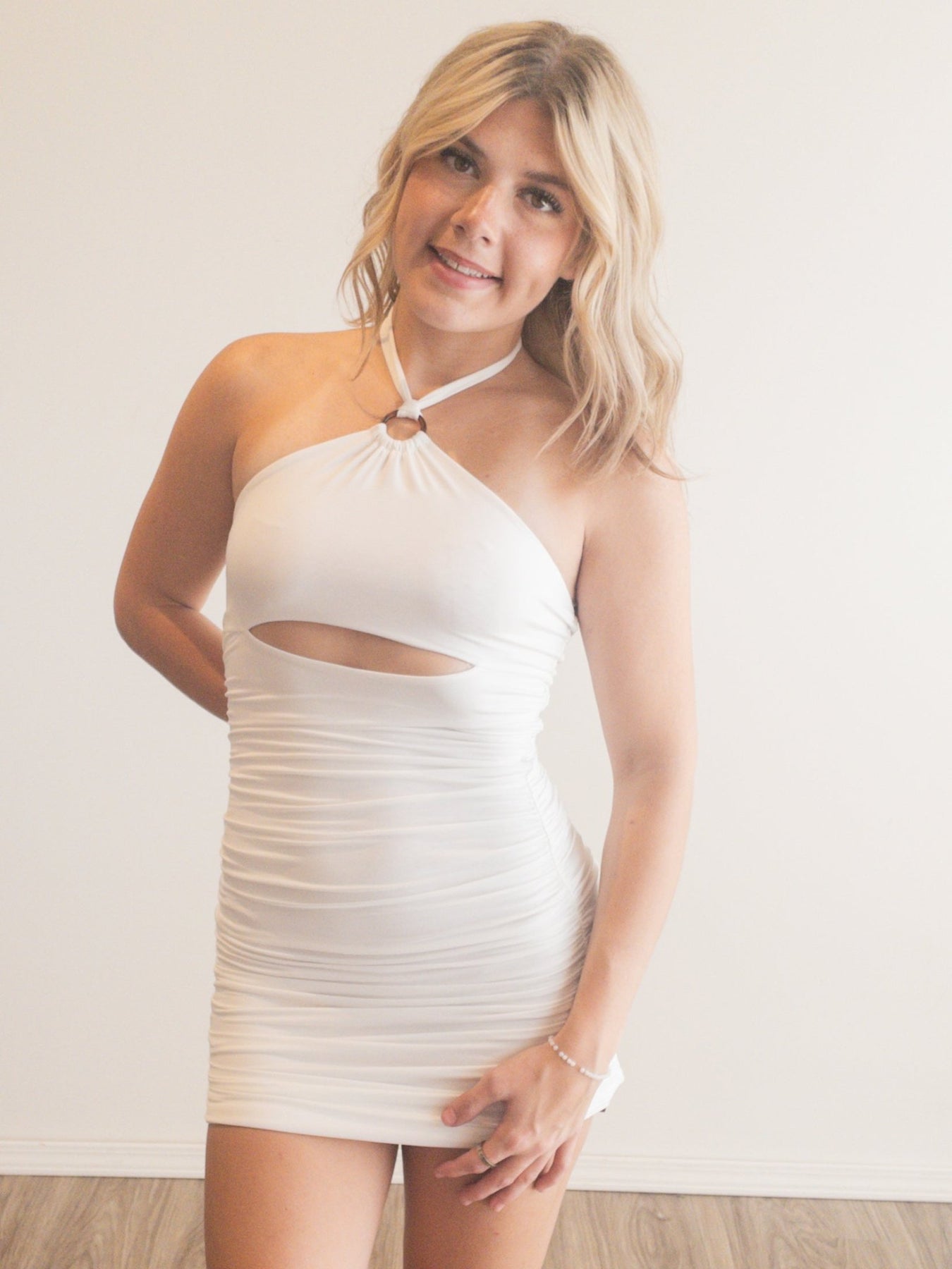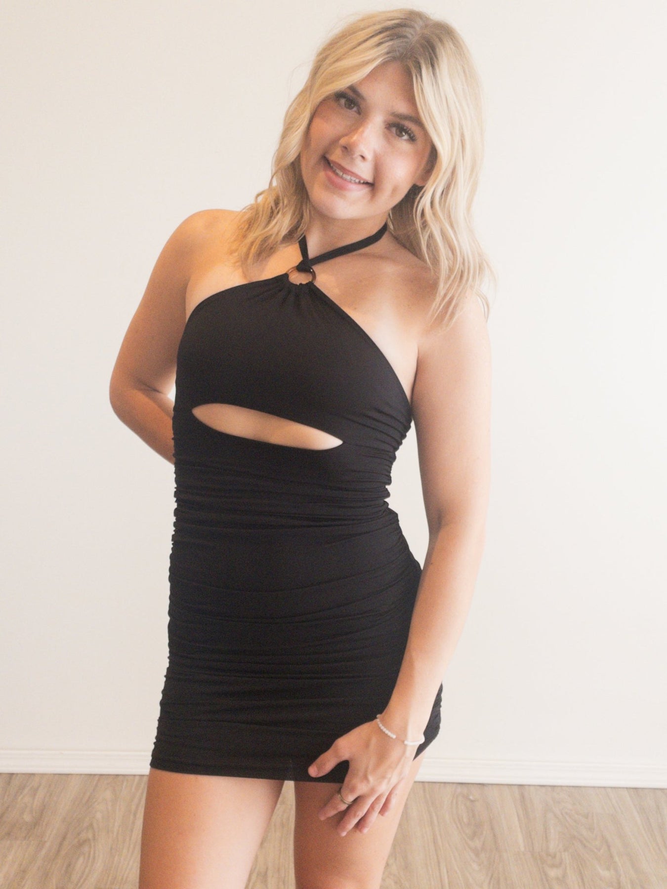 cut front halter mini dress with o ring