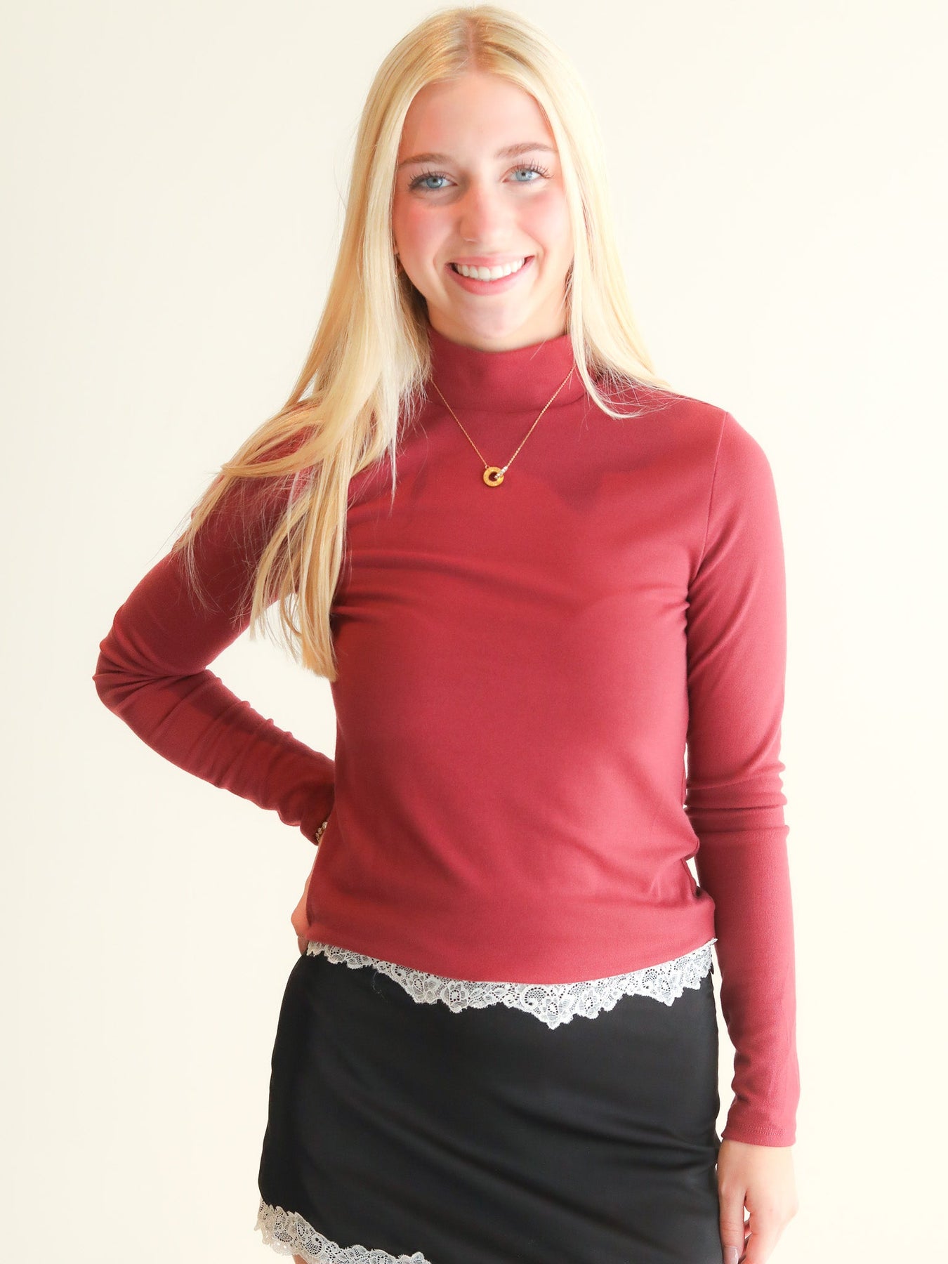 Elevate your everyday wardrobe with the Nothing But Perfection Top, a versatile knit turtleneck designed for effortless layering. The classic turtleneck silhouette pairs seamlessly with jackets, sweaters, and cardigans, making it the ideal foundation piece for countless outfits. Crafted from quality knit fabric, this top offers comfort and durability you can rely on season after season. Whether you're building a polished work look or casual weekend style, this essential turtleneck delivers the sophistication and flexibility your closet needs.