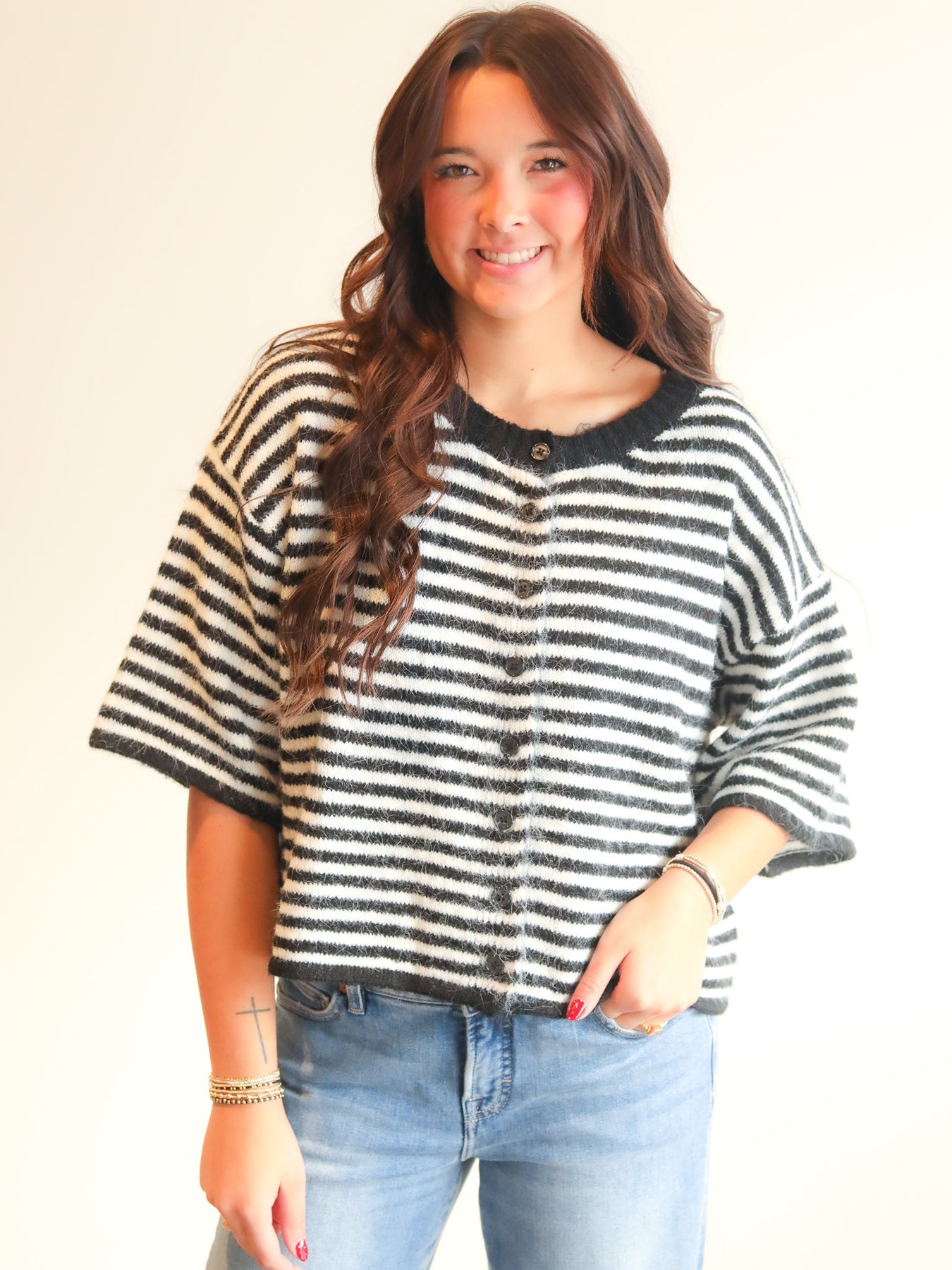 Elevate your everyday style with this striped cropped soft knit cardigan—the perfect layering piece for effortless sophistication. Crafted from luxuriously soft knit fabric, it drapes beautifully while maintaining its shape. The classic striped pattern adds visual interest to any outfit, while the cropped silhouette flatters your frame and pairs seamlessly with high-waisted bottoms, dresses, or tees. Whether you're heading to the office, meeting friends, or enjoying a casual day out, this versatile cardigan delivers comfort without compromising on style. A wardrobe essential that works as hard as you do.