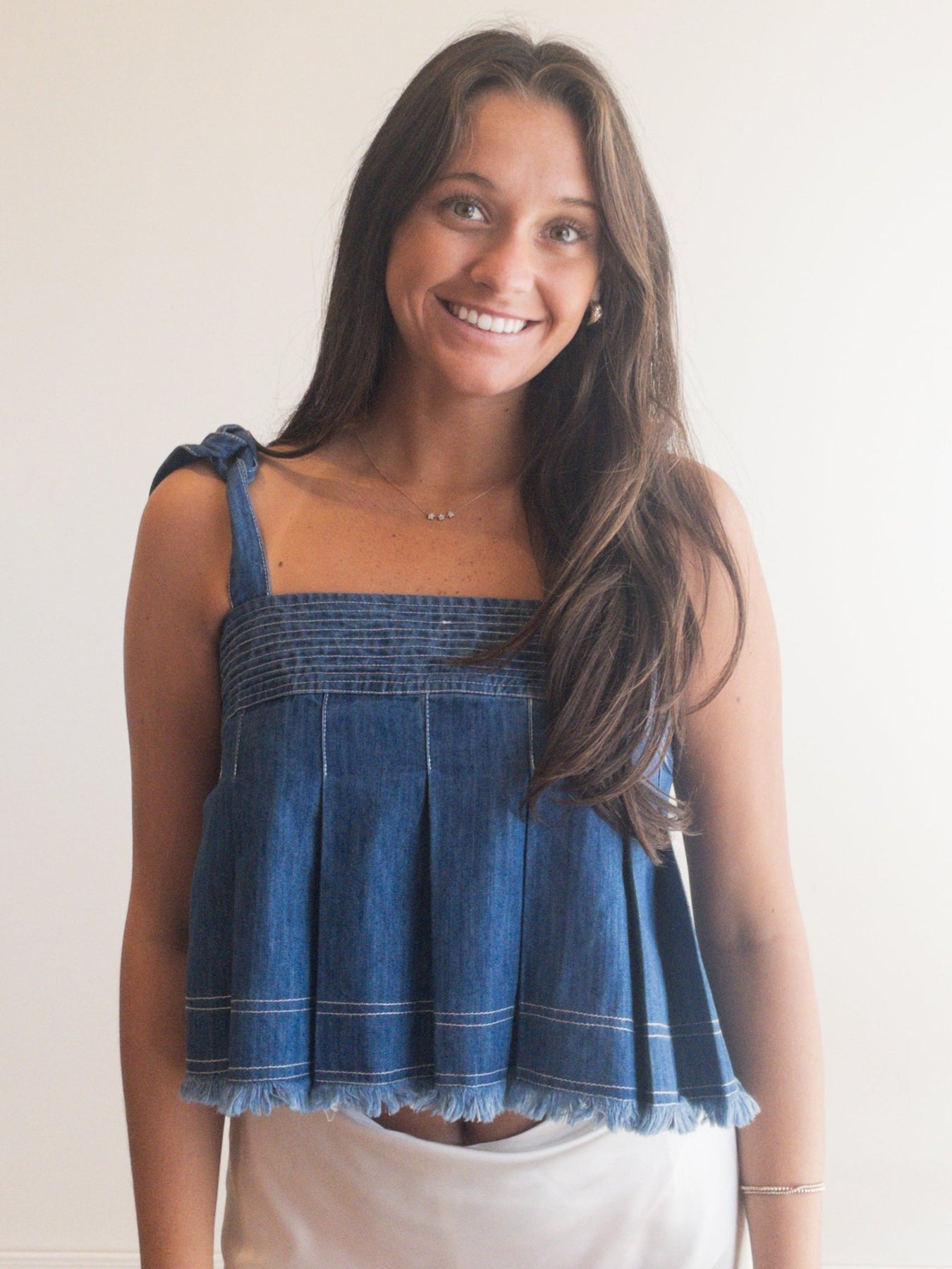 pleated denim crop top with tie straps