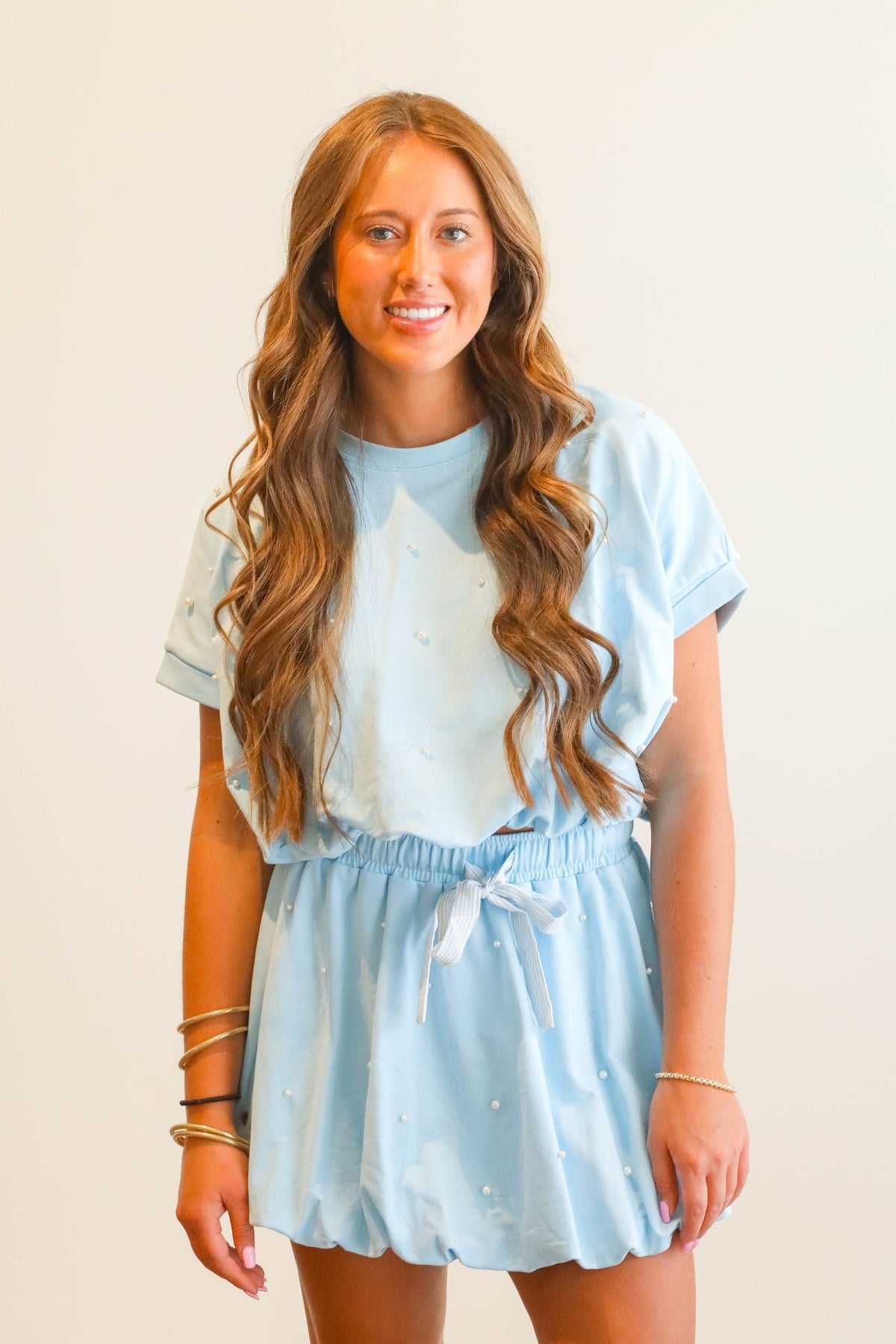 Elevate your style with the Feeling Bubbly Set, featuring a cotton terry mini skirt with a pearl-detailed waist tie and playful bubble hem. Paired with a matching bubble top, this set offers a chic, comfortable look perfect for sunny days or casual outings. Embrace effortless charm and standout style in one coordinated outfit.