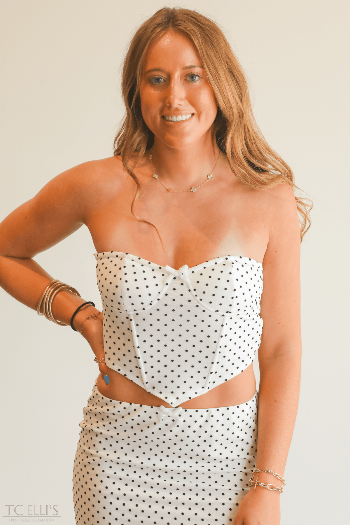 Make a bold statement with the Secret Safe With Me Set, featuring a playful polka dot corset top paired perfectly with a flirty mini skirt. This coordinated duo highlights your curves while offering a fun, chic look for nights out or special occasions. Embrace confidence and style effortlessly with this eye-catching ensemble.
