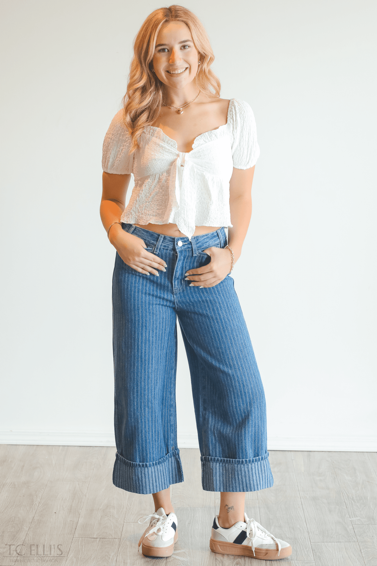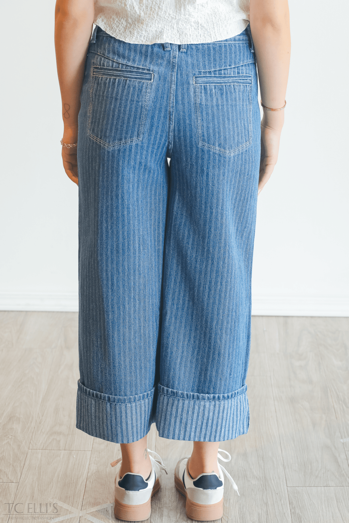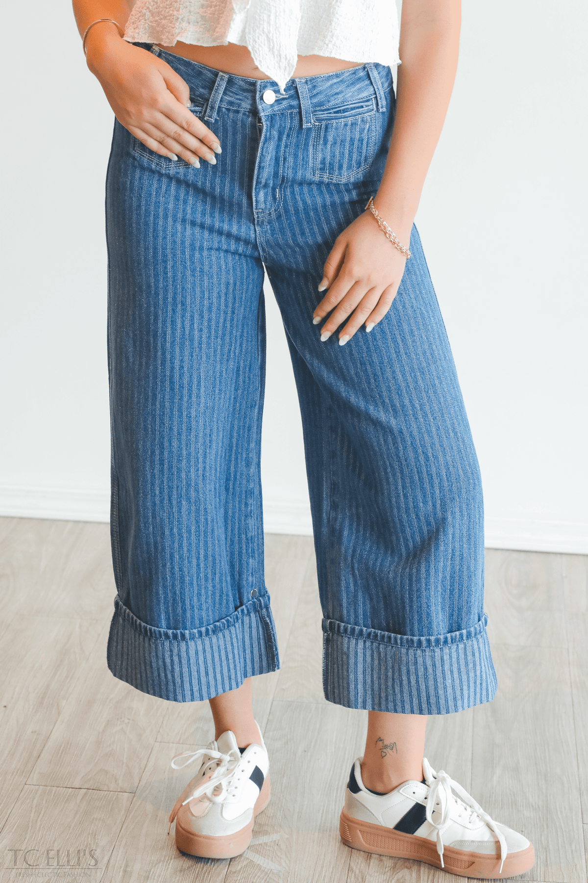 Elevate your casual style with the Short and Sassy Jeans, featuring a mineral-washed finish and subtle pinstripes for a unique, lived-in look. The rolled cuffs add a playful, modern twist, perfect for showcasing your favorite sneakers or ankle boots. These jeans combine comfort and style effortlessly, making them your go-to choice for effortless everyday chic. Pair them with a simple tee or a trendy blouse to create versatile looks that turn heads wherever you go.