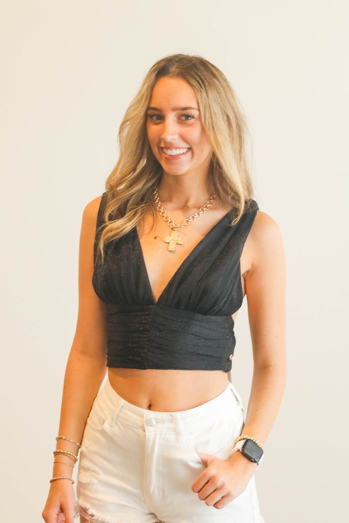 Elevate your evening look with the Walking Down Broadway Top. This metallic fishnet knit features a daring deep plunge back and a stylish tie closure, combining boldness with elegance. Perfect for making a statement, it offers a flattering fit that highlights your silhouette while adding a touch of shimmer to your outfit. Ideal for nights out or special occasions, this top ensures you stand out with confidence and style.