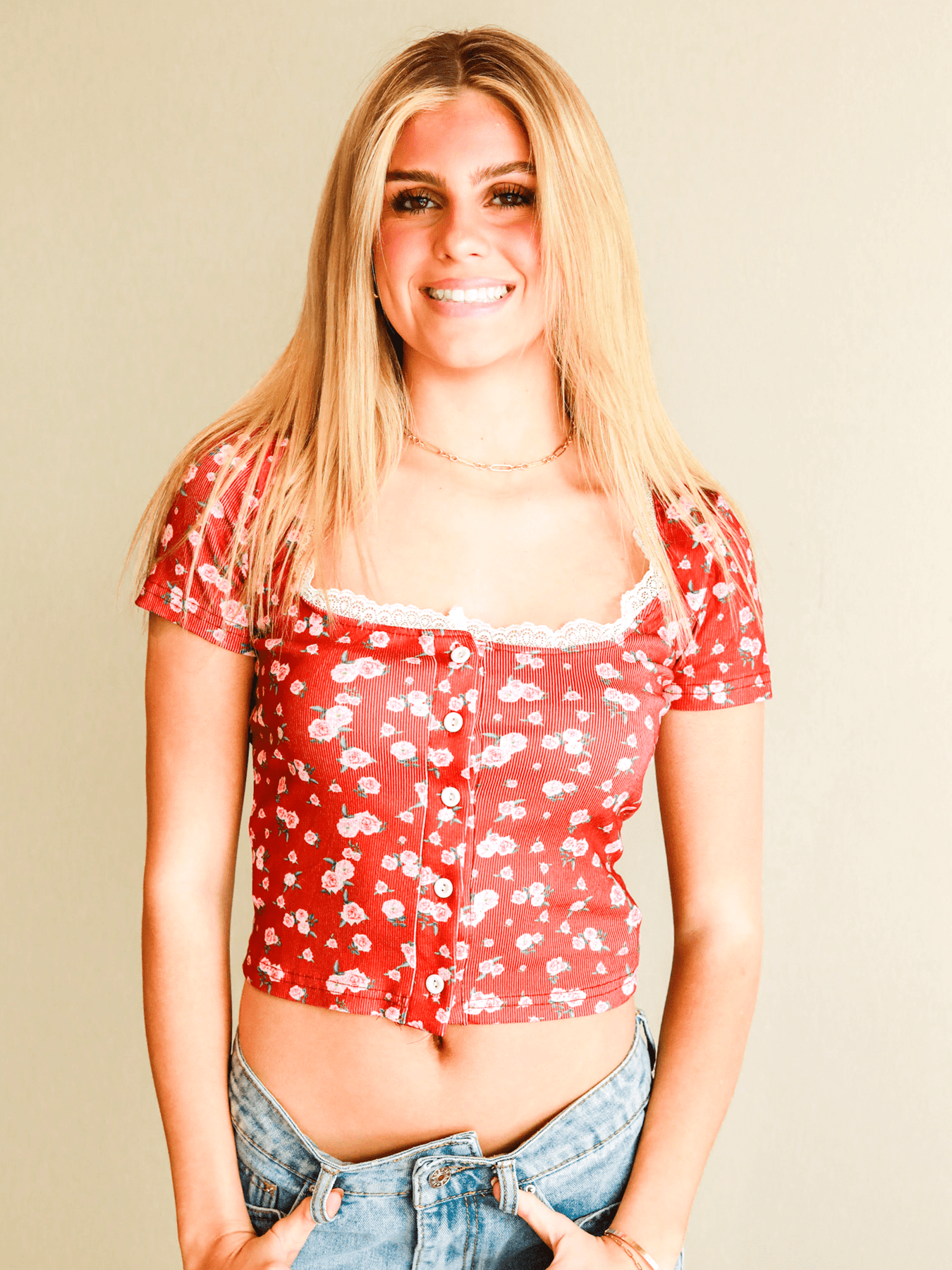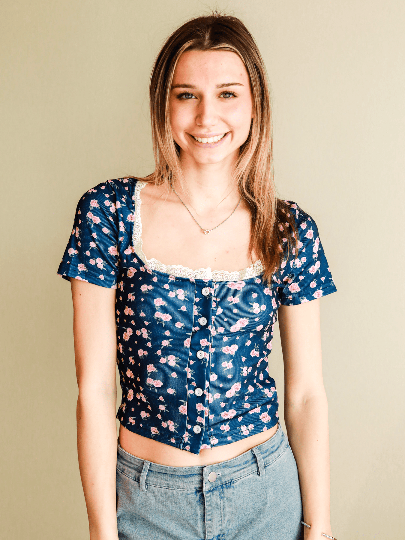 Turn heads effortlessly in the Bombshell Button Up Top. This stylish floral T-shirt is elevated with delicate lace detailing, adding a soft, romantic touch to an everyday favorite. Designed with a comfortable fit and a button-up front, it’s the perfect balance of relaxed and refined.