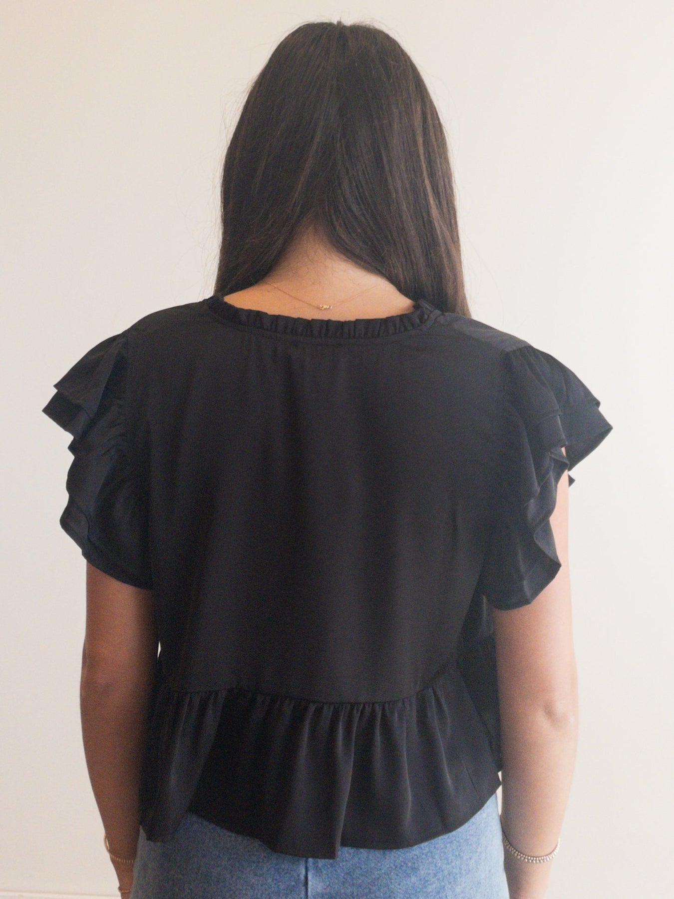 cropped satin blouse with ruffle sleeves and center front self tie