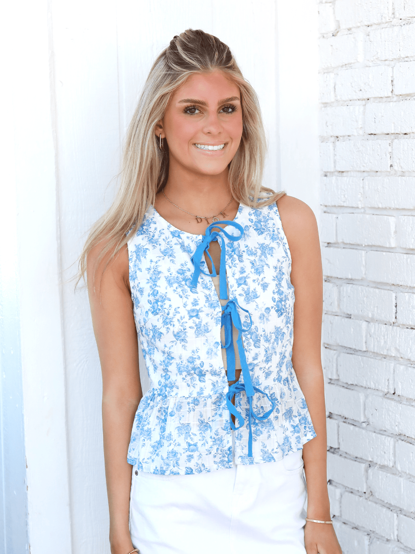 Glow effortlessly in the Sun Radiance Vest Top, a light and feminine piece designed for sunny days. Featuring a soft pale floral print and a flattering vest-style silhouette, this top is finished with delicate triple tie details that add charm and adjustability.