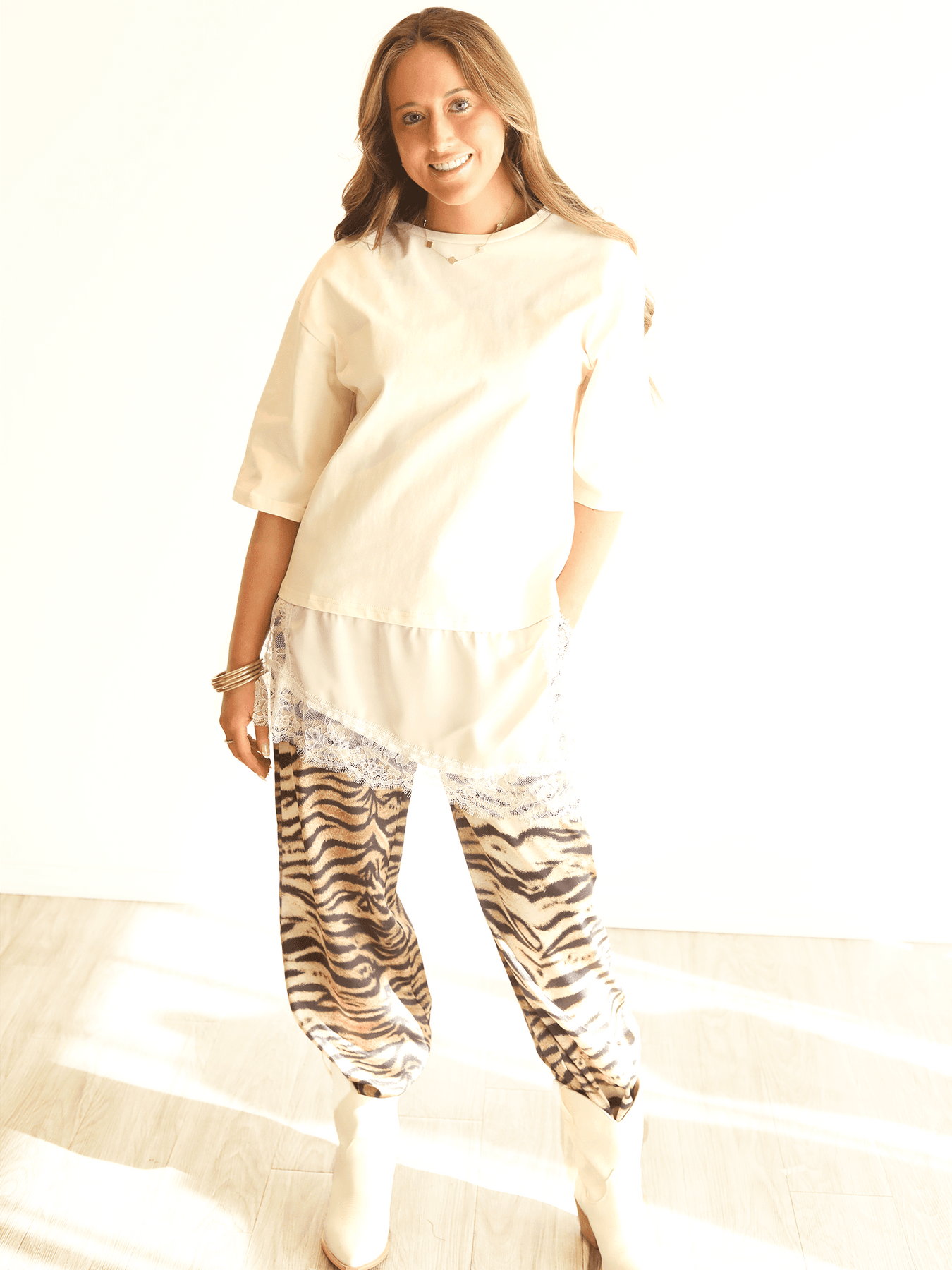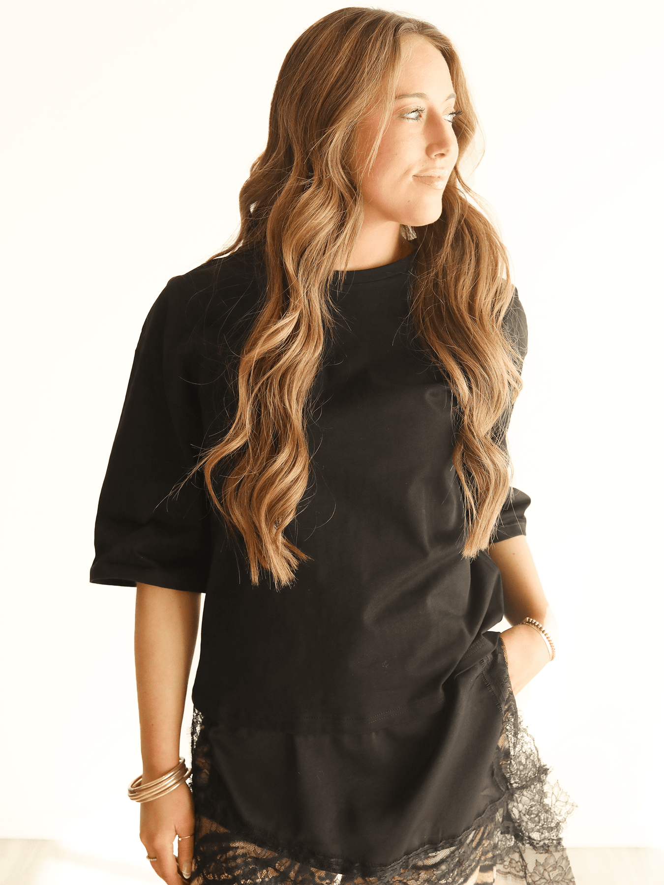 The Wondering Why Lace Tee Shirt features a classic tee silhouette elevated by an eye-catching asymmetrical lace hem. Designed for comfort with a fashion-forward finish, this top blends casual ease with delicate detailing—perfect for everyday styling with a bold touch.