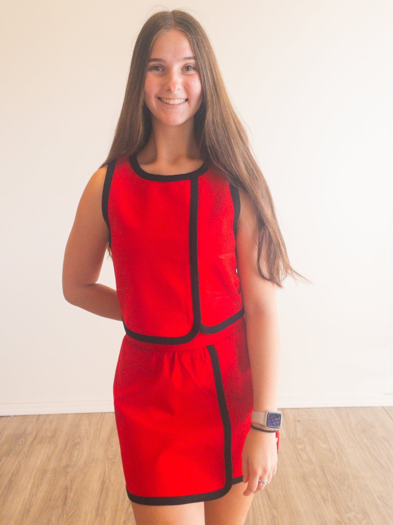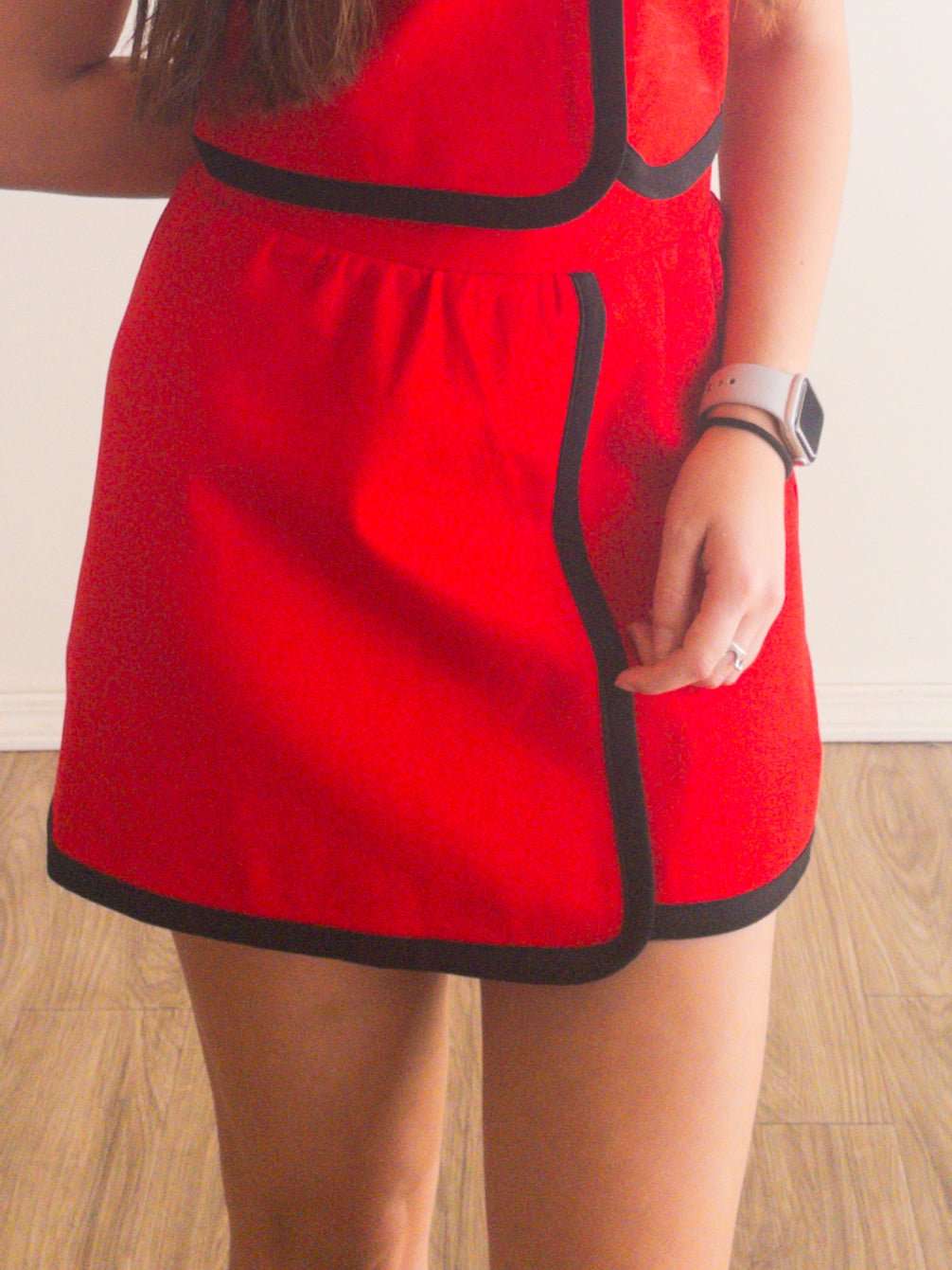 sleevless ponte cropped top with contrasting binding with ponte mini skirt with contrast binding